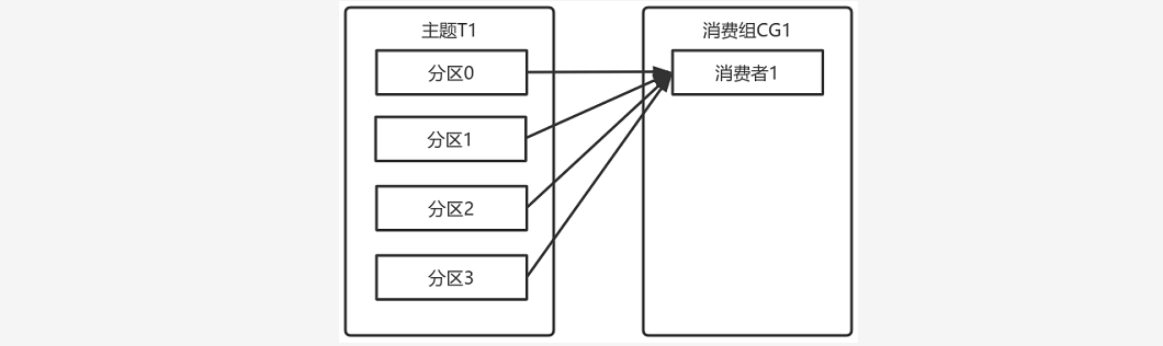 ~~~ 一个拥有四个分区的主题,包含一个消费者的消费组。