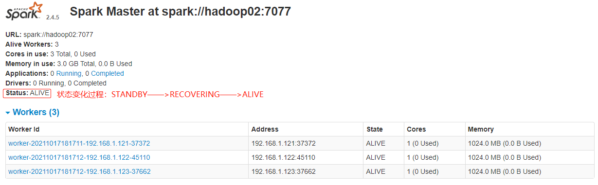 ~~~ 刚开始 Master 的状态是STANDBY,稍等一会变为:RECOVERING,最终是:ALIVE