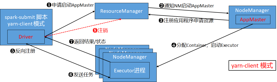 | yarn-client | Yarn 集群上运行,Driver 进程在本地, Work 进程在 Yarn 集群上, 部署模式必须使用固定值:--deploy-mode client。 Yarn 集群地址必须在或HADOOP_CONF_DIR 或YARN_CONF_DIR 变量里定义 |