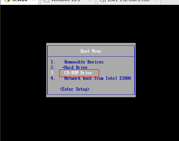 #手速要快,点一下esc进入boot menu(启动菜单)界面,选择第三个cd-rom驱动器