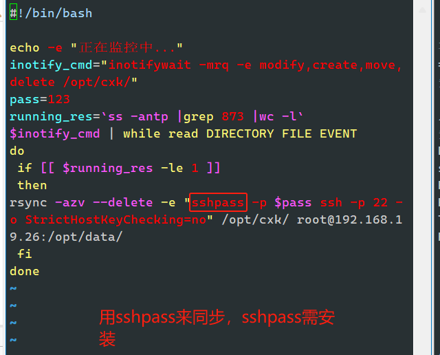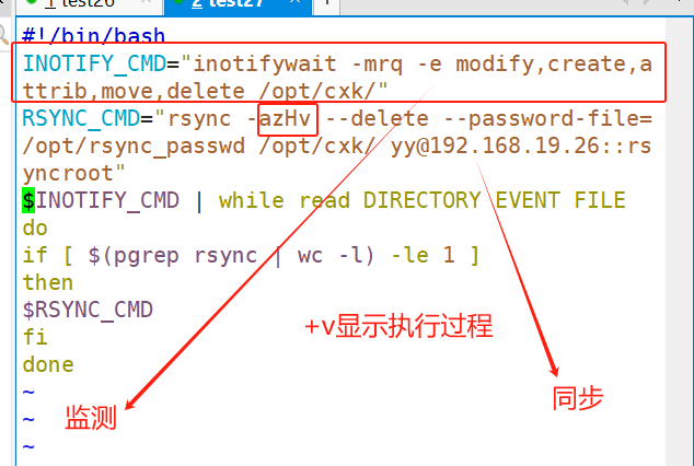在另外一个终端编写触发式同步脚本(注意,脚本名不可包含 rsync 字符串,否则脚本可能不生效)