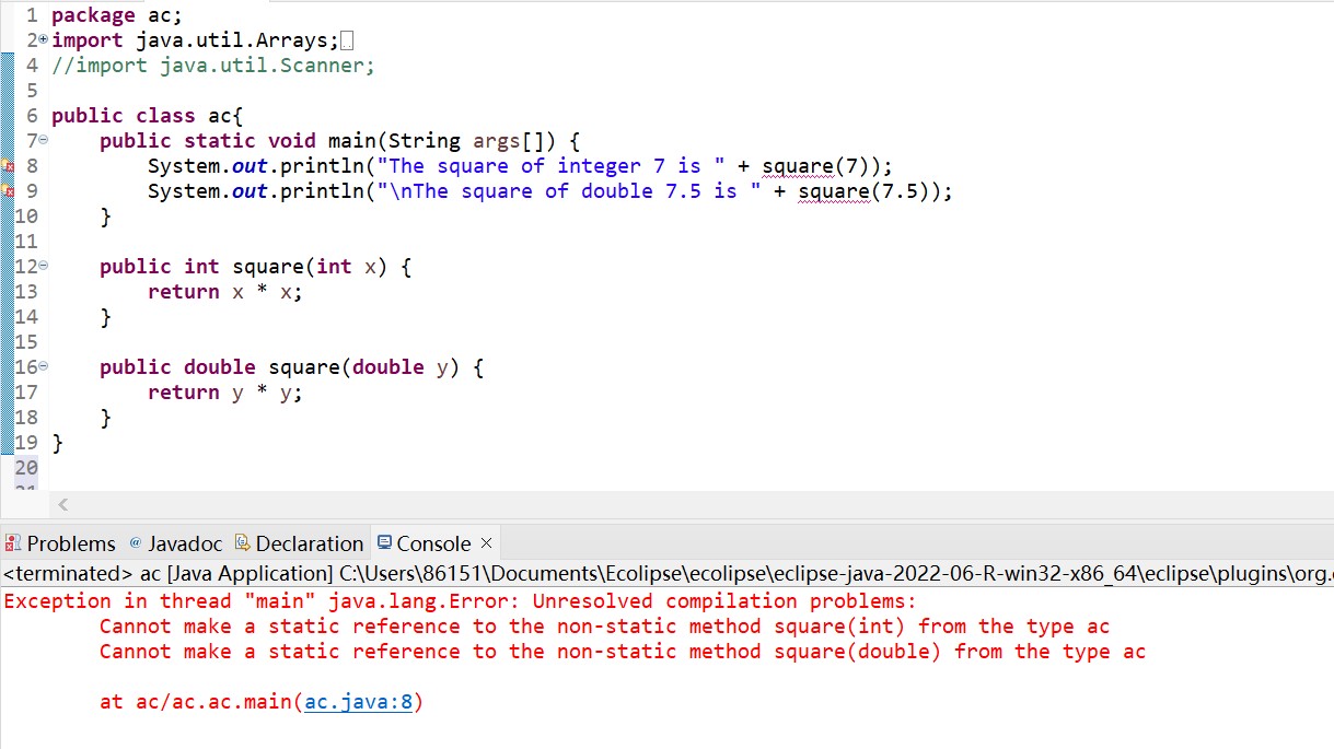 这是用静态方法进行的平方数计算代码,此时它可以正常运转输出正确结果