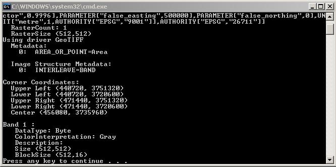 - Now you can run the program with some data. Include a reference to one of the raster files in the Command line arguments field of your Debug options (in the properties of your GDALInfo project; don't forget to put the path inside double quotes of it includes blanks).