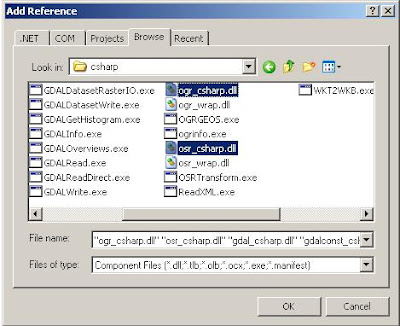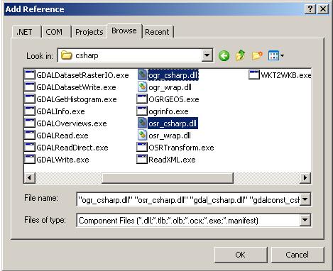 - Add four of.the dll-files that can can be found at C:\Program Files\GDAL\bin\gdal\csharp (or wherever your installation path of the current binaries is) to your project references: gdal_csharp.dll, gdalconst_csharp.dll,ogr_csharp.dll and osr_csharp.