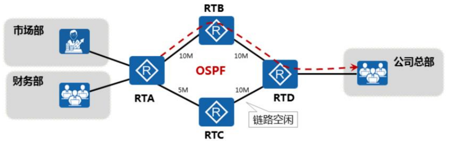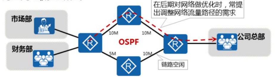 调整网络流量路径:如图,根据OSPF协议计算生成的路由,市场部和财务部访问公司总部都选择通过一条开销最小的路径,即使该路径发生拥塞也如此,而另外一条路径的链路带宽则一直处于空闲状态,这样就造成了带宽浪费的问题。