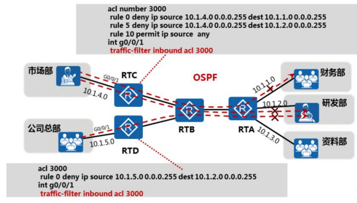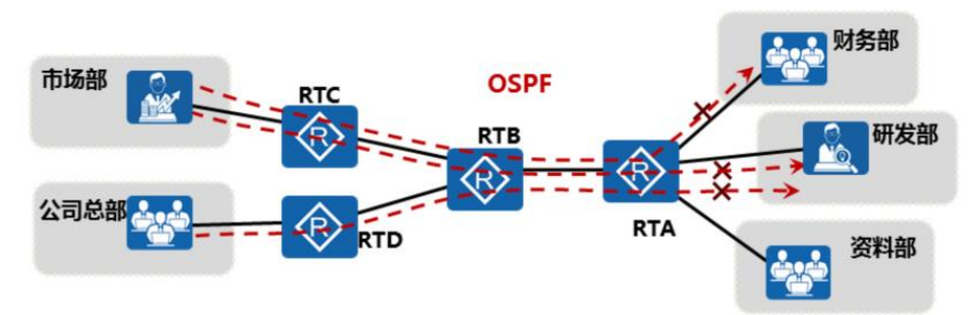 有这样一个场景,公司内市场部的流量不允许访问财务部和研发部,这时就需要对网路中的流量进行控制来达到我们想要的结果。