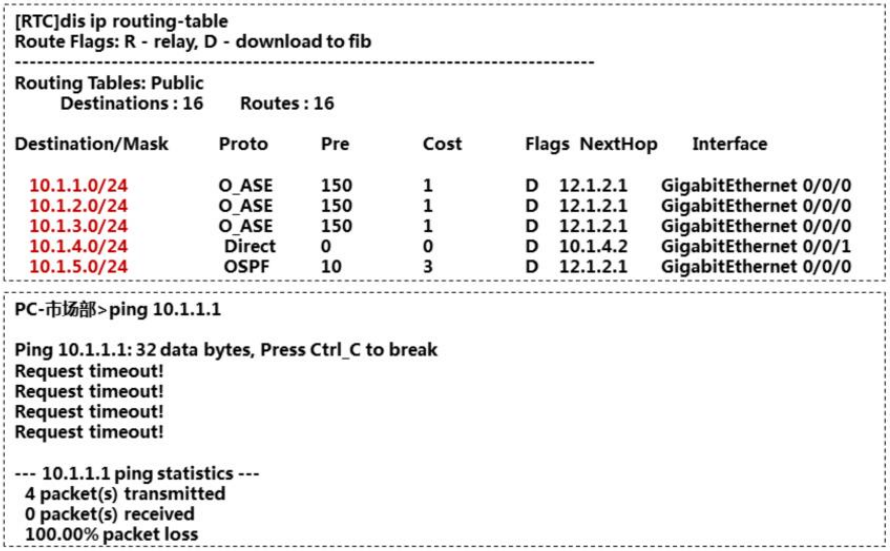 经测试,在设置完流量过滤后,RTC的路由表仍然有全网的路由,且市场部无法访问财务 部和研发部,对于其他部门仍可正常访问。同样,RTD的路由表也有全网的路由,且公司总部无法访问研发部,其他仍可正常访问。