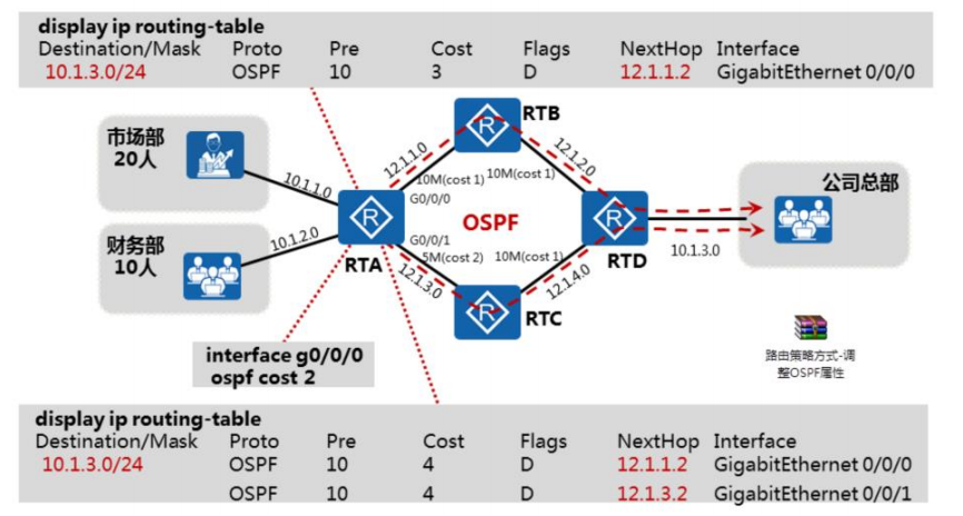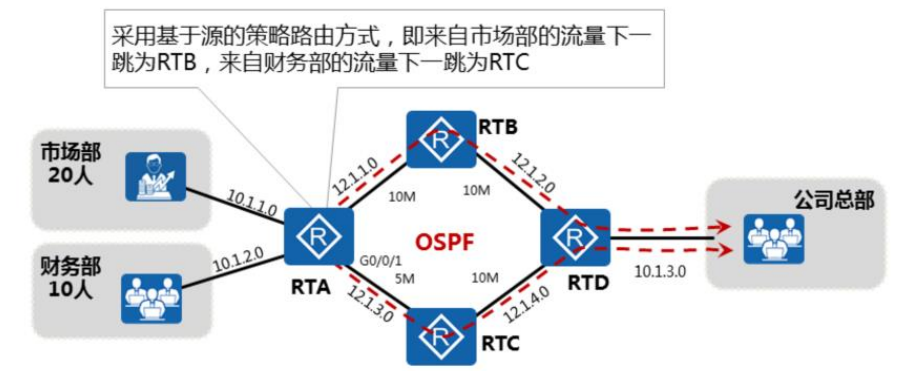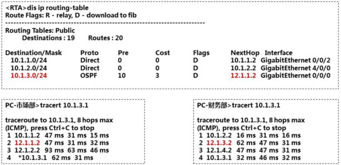 新要求:为了充分利用链路利用率,先要求市场部访问总部流量路径为RTA-RTB-RTD;财务部访问公司总部流量路径为RTA-RTC-RTD。