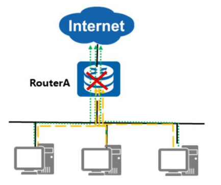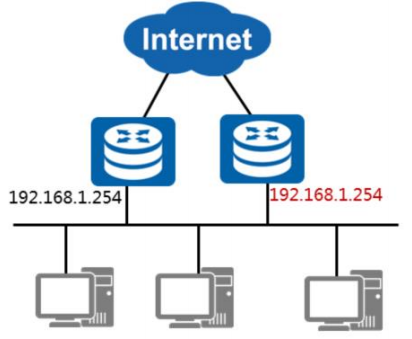 如果引入双网关,这样可以实现网关的备份,但是存在一个问题:网关间的IP地址冲突,主机会频繁切换网络出口。如果配置不同的IP地址,每个主机只能配置一个网关,当这一网关发生故障时,只能通过管理员手动修改网关配置,时间取决于管理员的操作时间,这也就失去备份的意义。