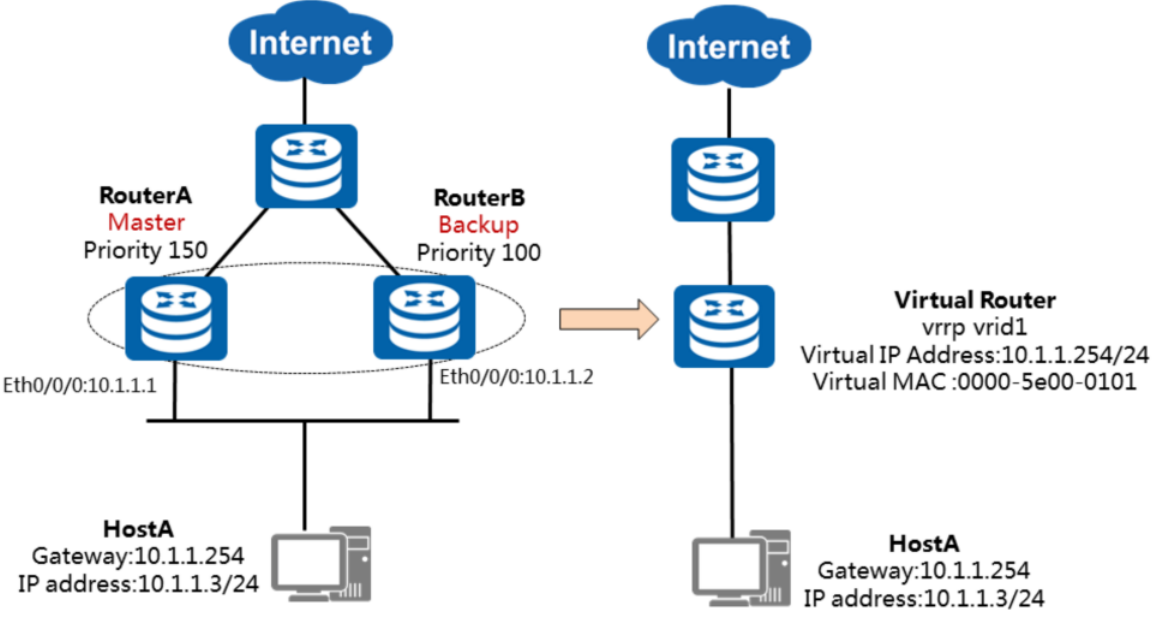 - 虚拟IP地址(Virtual IP Address):虚拟路由器的IP地址,一个虚拟路由器可以有一个或多个IP地址,由用户配置。如RouterA和RouterB组成的虚拟路由器的虚拟IP地址为10.1.1.254/24。