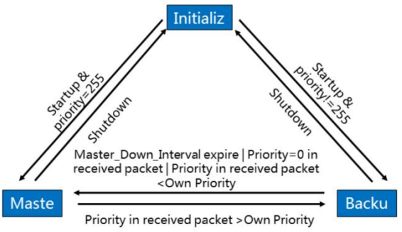 VRRP协议状态机有三种状态:Initialize(初始状态)、Master(活动状态)、Backup(备状态)。