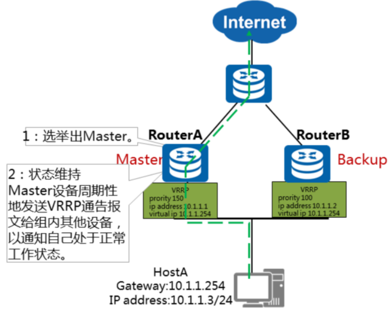 - Master路由器(Virtual Router Master):承担转发报文任务的VRRP设备,如RouterA。