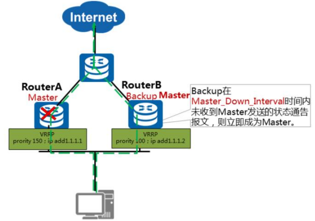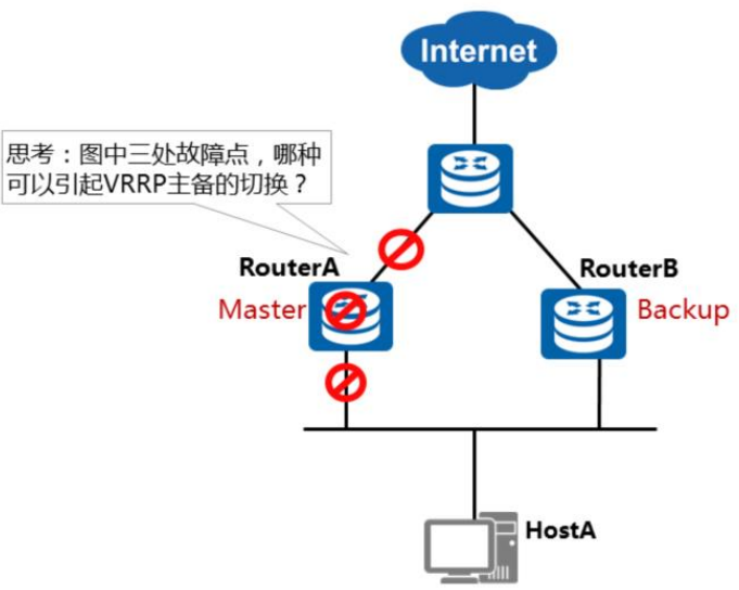 - 若RouterA或连接RouterB的接口发生故障时都会引起VRRP主备切换,因为Backup设备无法在Master_Down_Interval时间内收到Master设备发送的协议报文了。