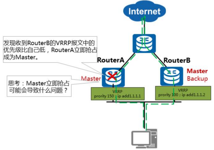 - 图中RouterA故障恢复后,立即抢占可能会导致流量中断,因为RouterA的上行链路的路由协议可能未完成收敛,这种情况则需要配置Master设备的抢占延时。