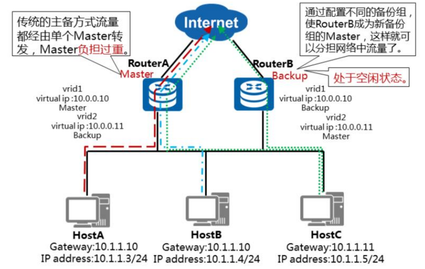 - 与主备备份方式的不同点在于:负载分担方式需要建立多个VRRP备份组,各备份组的Master设备分担在不同设备上;单台设备可以加入多个备份组,在不同的备份组中扮演不同的角色。