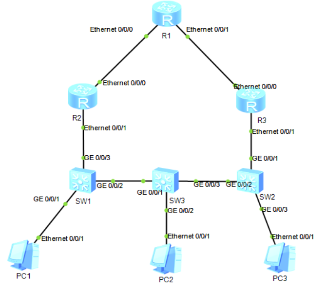 (1)主备方式配置(不推荐):其中R2为主,R3为备,正常情况流量全部经过R2,当R2出现故障时,R3切换为主。