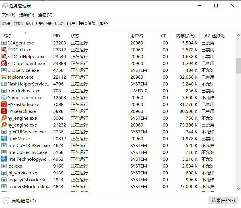 在详细信息栏目,可以看到所有正在运行的服务的信息信息;可以通过运行的服务,查到相关运行的后台进程。