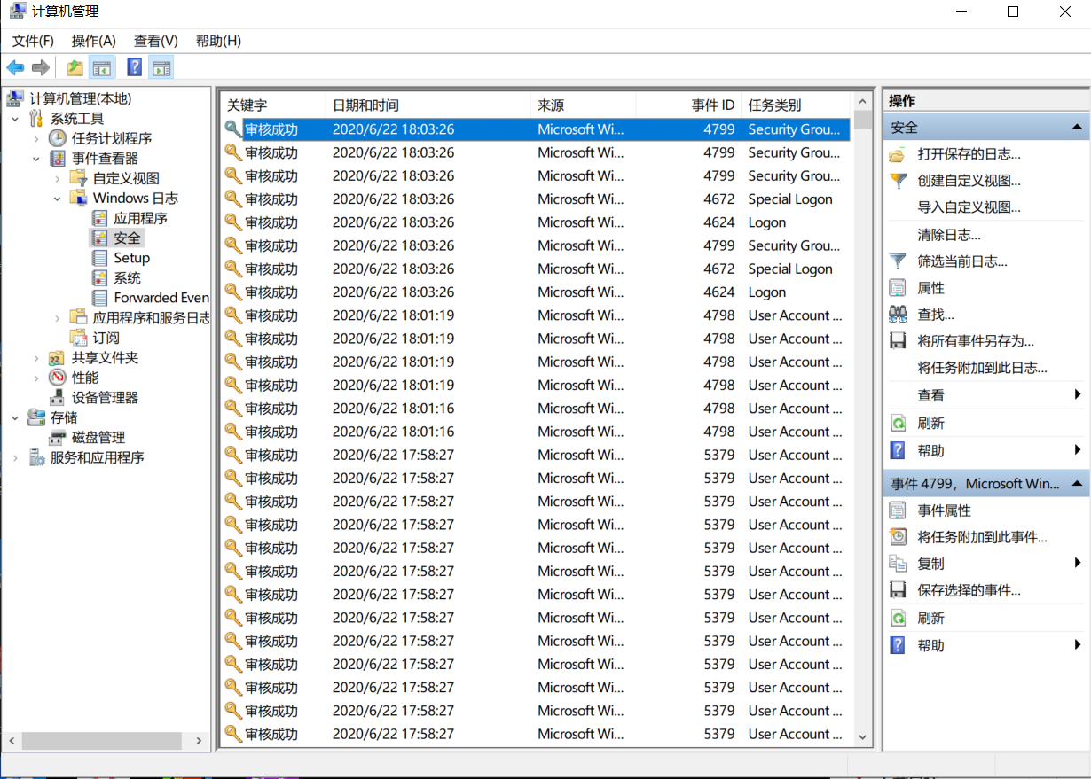windows用户所有的登录注销、安全策略更改都会以安全日志的形式记录。查看方式:计算机管理->系统工具->事件查看器->Windows日志->安全。我们可以通过查看安全日志,溯源黑客的入侵行为(如果黑客没有清理安全日志的话)。