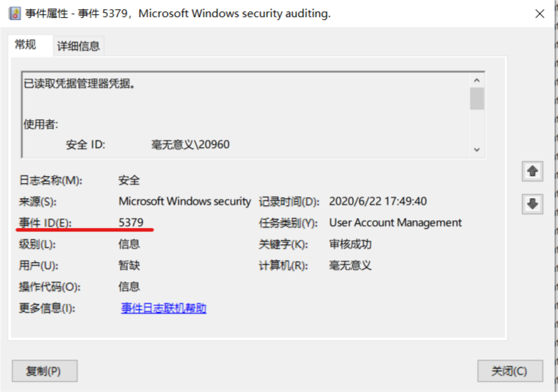 可以通过事件ID快速检索日志,比如5379代表已读取凭据。