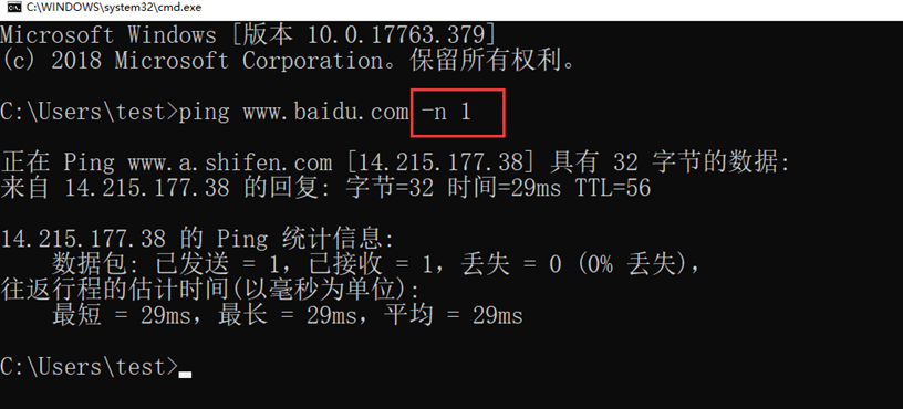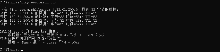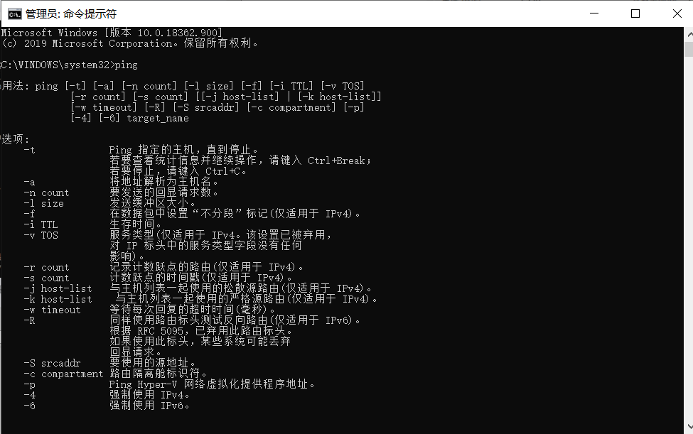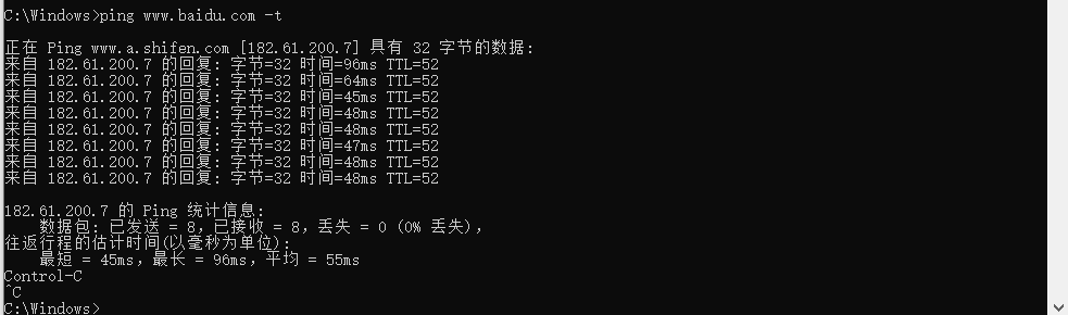 指定ping继续向目标发送回显请求消息,直到被中断为止。 要中断并显示统计信息,请按CTRL + break。 要中断并退出ping,请按CTRL + C。