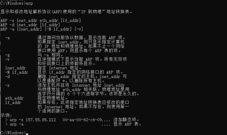 显示和修改地址解析协议(ARP)缓存中的条目,其中包含一个或多个用于存储IP地址及其解析的以太网或令牌环物理地址的表。计算机上安装的每个以太网或令牌环网络适配器都有一个单独的表。在没有参数的情况下使用,arp显示帮助。