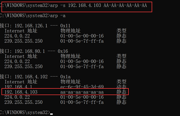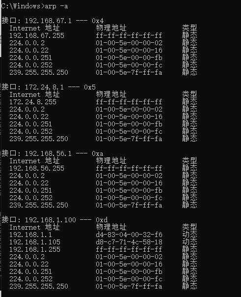 显示本地的所有ARP表,要显示特定IP地址的arp缓存条目,请使用带有Inetaddr参数的arp -a,其中Inetaddr是IP地址。