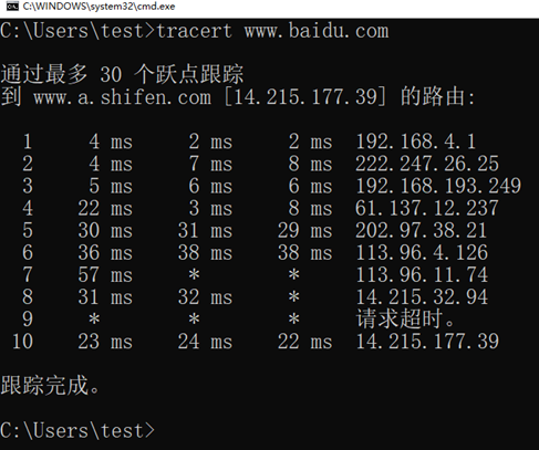 确定通过发送Internet控制消息协议(ICMP)回显请求或 以递增的生存时间(TTL)字段值向目标发送消息。路径显示源主机和目标之间路径中路由器的近/侧路由器接口列表。近侧接口是最接近路径中发送主机的路由器接口。不用参数,tracert显示帮助。