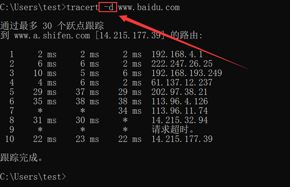 防止tracert尝试将中间路由器的IP地址解析为其名称。 这样可以加快Tracert结果的显示