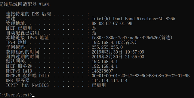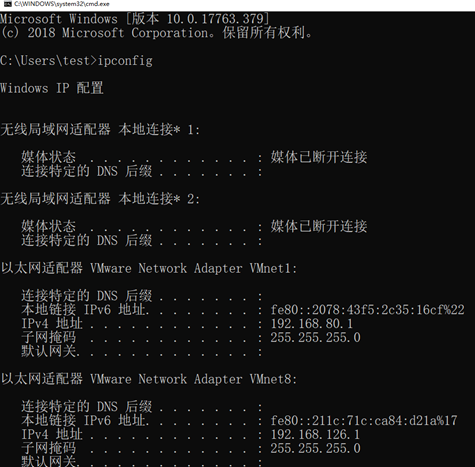 显示所有当前TCP/IP网络配置值,并刷新动态主机配置协议(DHCP)和域名系统(DNS)设置。ipconfig在没有参数的情况下使用,为所有适配器显示Internet协议版本4(IPv4)和IPv6地址、子网掩码和默认网关。