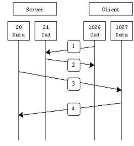 FTP服务器由命令通道了解客户端的需求后,会主动地由port 20向客户端的数据端口连接,这个连接也会经过三次握手。此时FTP的客户端与服务器端会建立两条连接,分别用在命令的执行与数据的传递。而默认FTP服务器端使用的主动连接端口就是port 20。