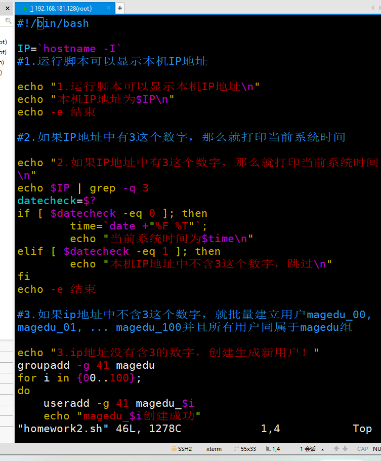 3. 如果ip地址中不含3这个数字,就批量建立用户magedu_00, magedu_01, ... magedu_100并且所有用户同属于magedu组