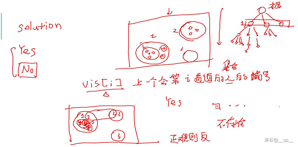 如图,$vis[i]$ 表示上个会 $i$ 道题人的序号,判断即可。