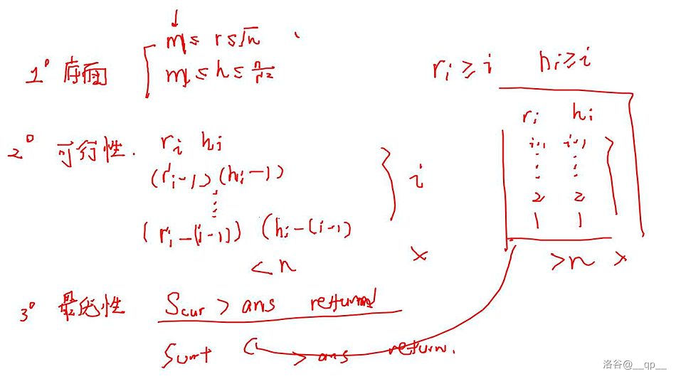 最优性剪枝:将 $h$ 设置为尽可能小地放蛋糕,不考虑体积为 $N\pi$ 这一限制的情况下,得到的代价。