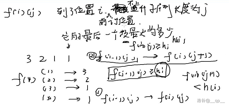 2. 如果 $ f[j] >= h[i] $,那么它们可以与 $ h[i] $ 拼成一个不上升子序列,结尾为 $ h[i] $,可以用来更新 $ f[j+1] $。