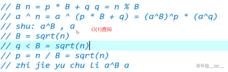 我们预处理出 $2^0$ 个 $a$ 相乘,$2^1$ 个 $a$ 相乘,…,一直到 $2^k$ 个 $a$ 相乘,使得 $2^k\ge 𝑛$,接下来我们只需要把 $n$ 分成若干个 $2$ 的幂次相加就行了…这也是背包里二进制分组的思想。复杂度显而易见是 $O(k+\log n)=O(\log n)$ 的。