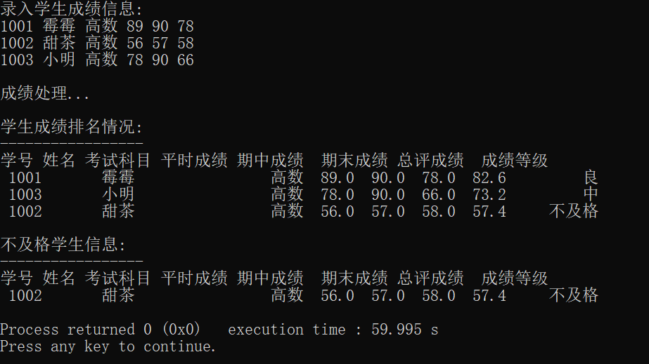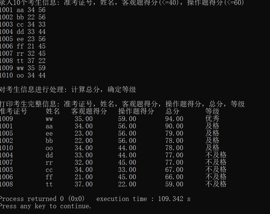 printf("\n打印考生完整信息: 准考证号,姓名,客观题得分,操作题得分,总分,等级\n");