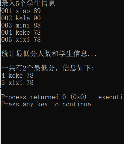 printf("\n一共有%d个最低分,信息如下:\n", count);