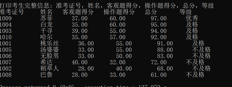 printf("\n打印考生完整信息: 准考证号,姓名,客观题得分,操作题得分,总分,等级\n");