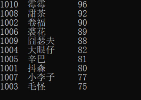 printf("%-6d%-10s%3d\n", st[i].num, st[i].name, st[i].score);