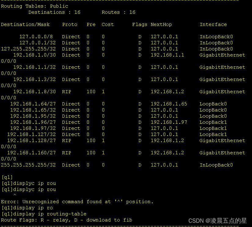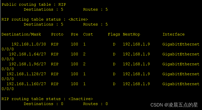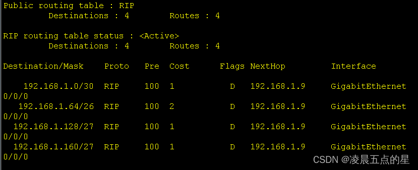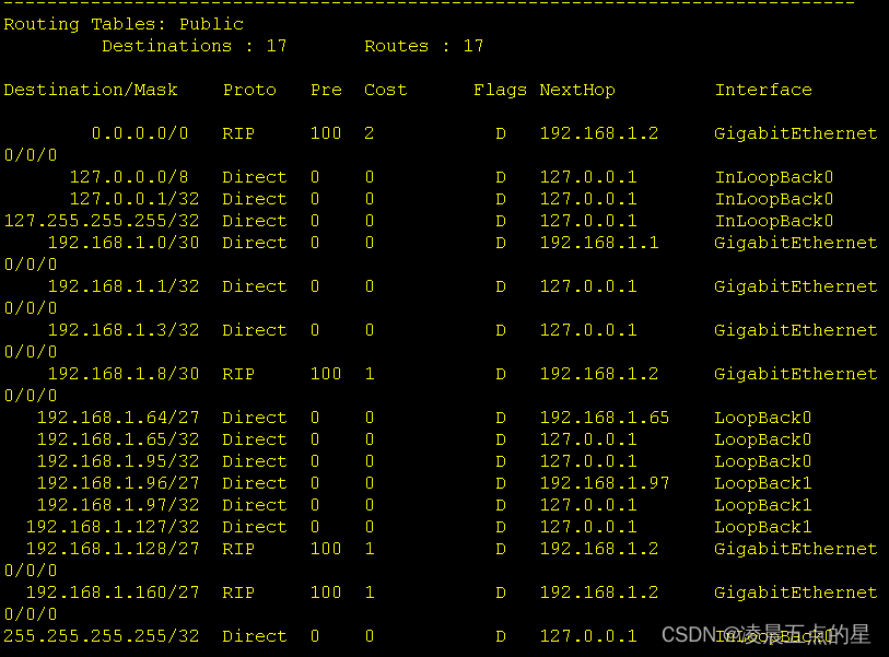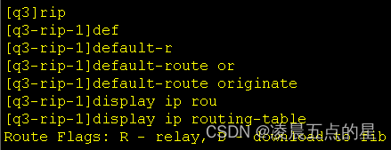 我们可以很明显的看到引入后多了一条RIP协议下的缺省路由,而这也是动态与静态的不同之处,动态只用给内外网的边界路由器输入缺省命令