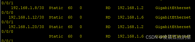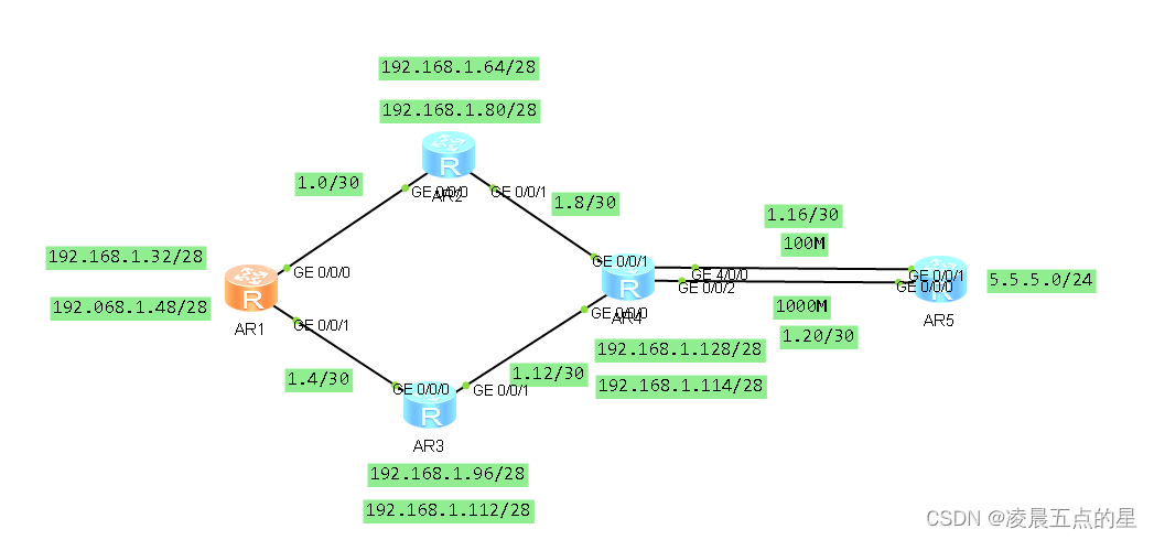 通过图片我们可以看出此静态实验有6个骨干链路,8个子链路,我们用AR1举例eg:AR1周围连接着6个链路分别为两个骨干四个子链路因此其需要配置8个下一跳如此清晰明了
