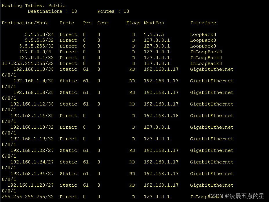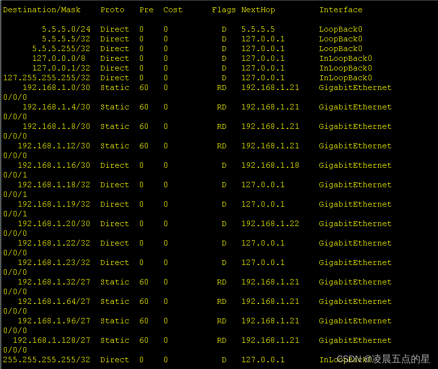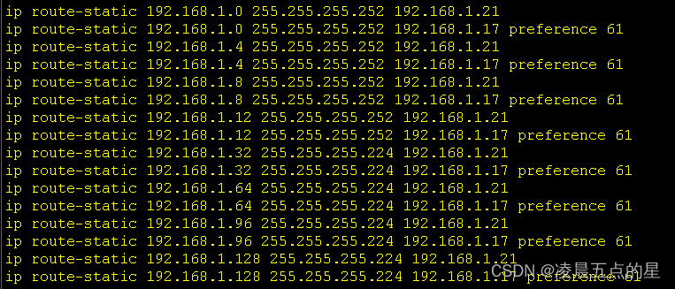 考点:ip划分;环回loop back的配置;路由器接口ip的配置(ip add);添加下一跳(ip route-static);缺省路由(ip route-static 0.0.0.0 0.0.0.0 12.1.1.2);空接口(ip route-static 192.168.1.1 Null0);设置优先级(preference 61)
