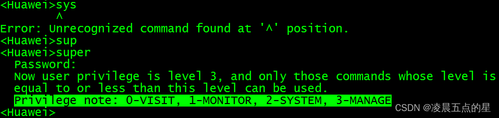 local-user huawei privilege level 15 //模拟器上权限默认为15,权限较低则无法进入系统试图,但可使用super命令进入