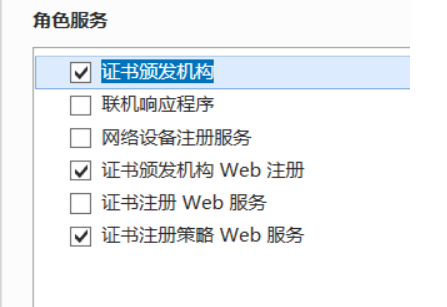 通知配置证书服务——角色服务全选——企业——CA——默认——下一步——选择证书稍后分配——配置