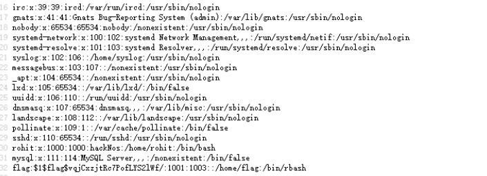 echo 'flag:$1$flag$vqjCxzjtRc7PofLYS2lWf/:1001:1003::/home/flag:/bin/rbash' > test