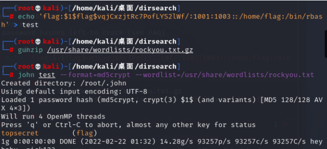 john test --format=md5crypt --wordlist=/usr/share/wordlists/rockyou.txt