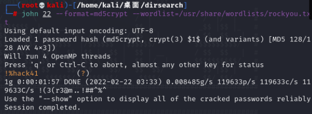 john 22 --format=md5crypt --wordlist=/usr/share/wordlists/rockyou.txt