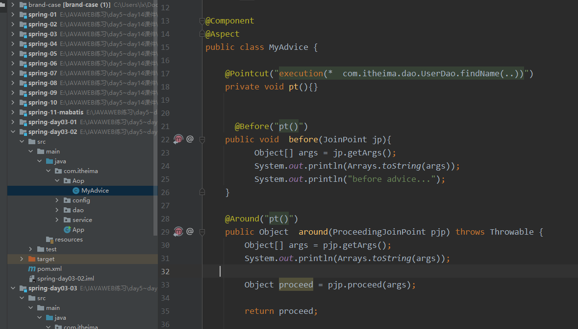 第二步写@aspect注解 来告知这是一个AOP类 这里要配合在spring容器中写@EnableAspectJAutoProxy 一起使用这样就可以让spring容器知道这是一个AOP类
