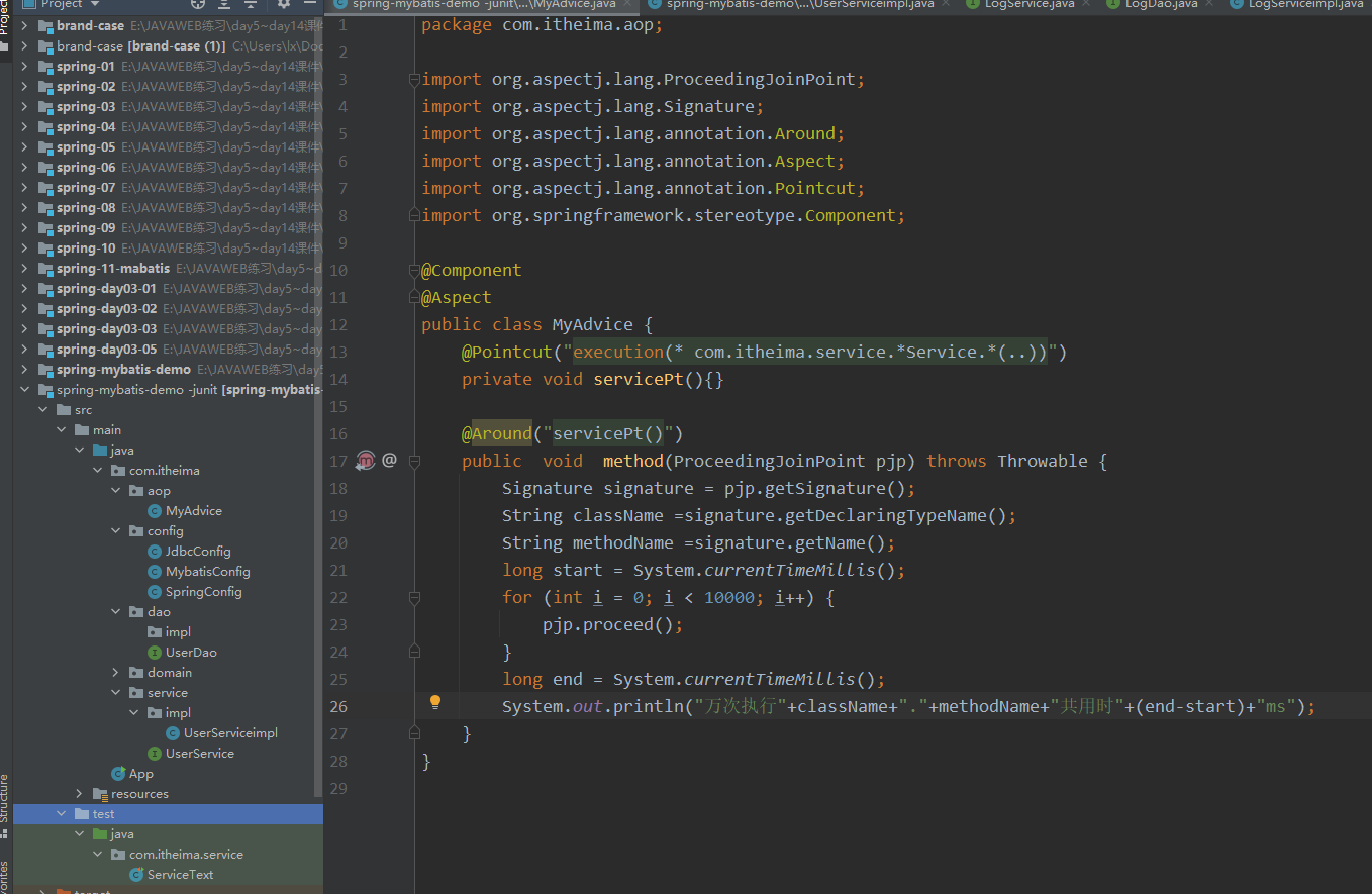 第三步在通知类中先定义一个通知用来对在切入点前后执行的操作,也就是增强的共性功能