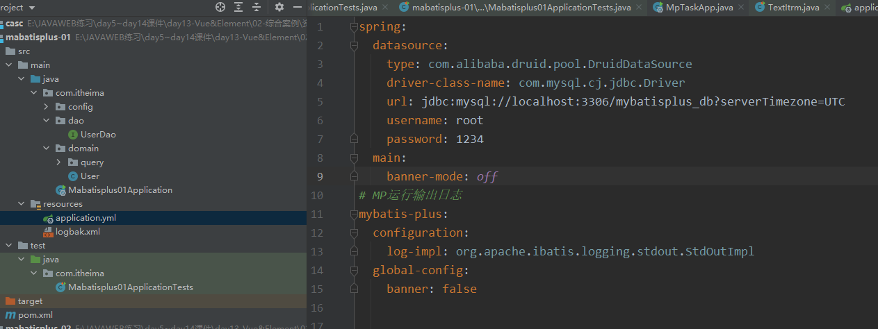 然后在对应的yml配置中配置对应的数据库表和url 账号 密码 这里一定要记得导入druid坐标